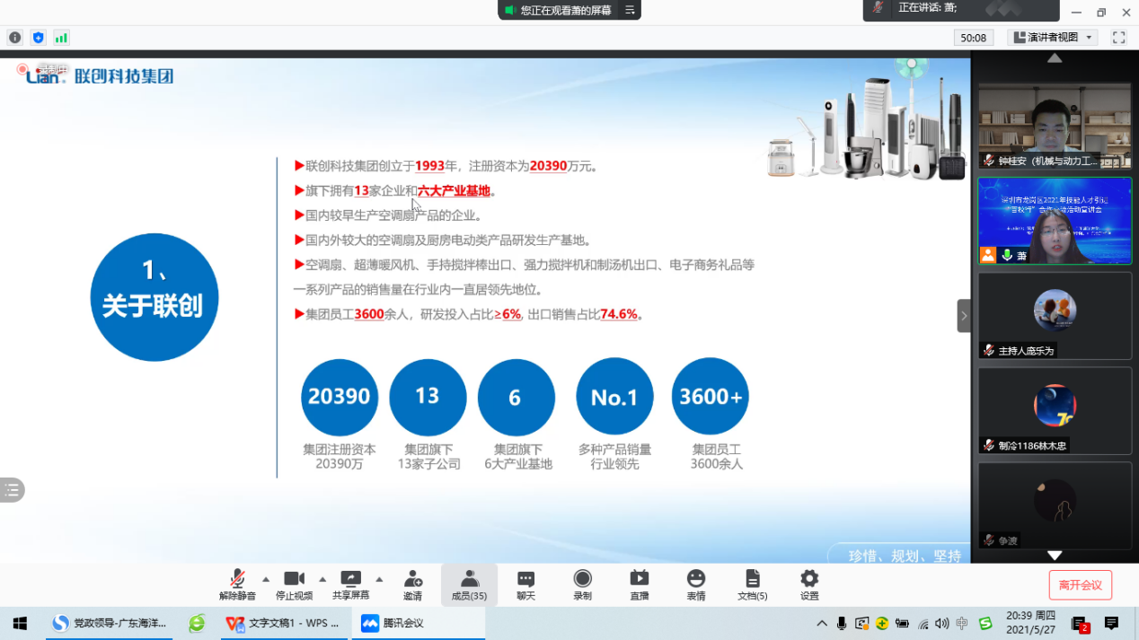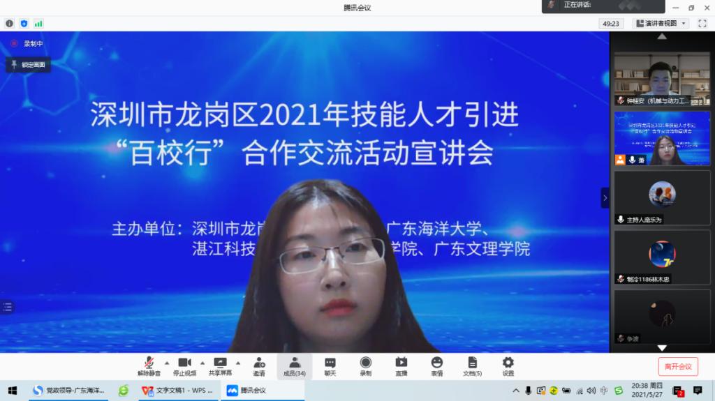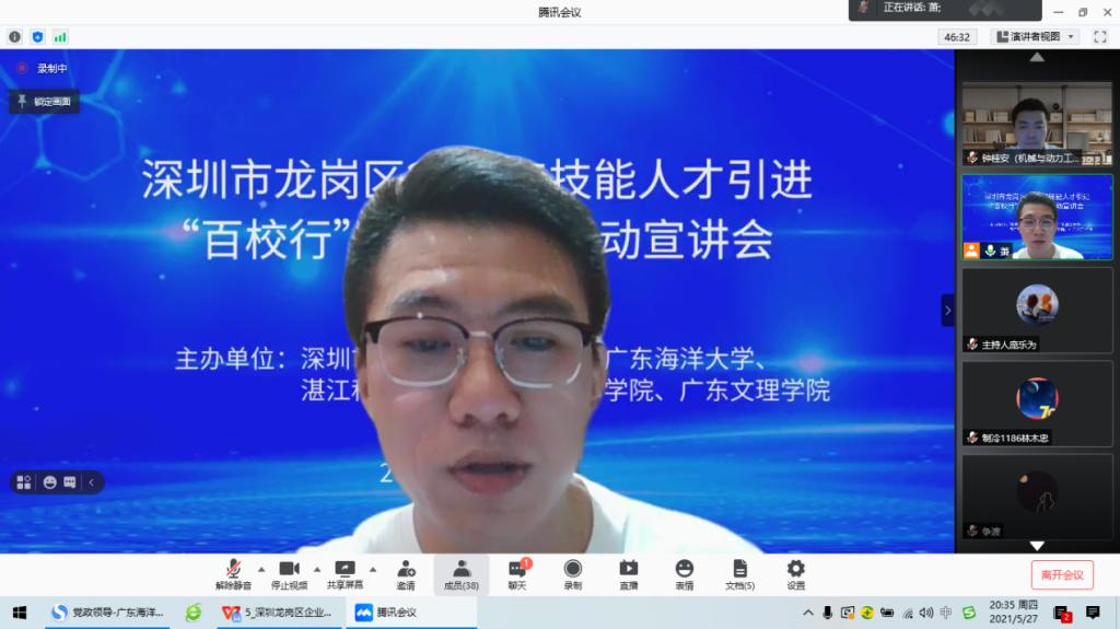 为加强校企合作,解决员工就业问题。5月27日晚,公司通过腾讯会议成功举办深圳市龙岗区2021年引进技能人才“百校行”合作交流活动宣讲会。参加本次网络招聘宣讲会的企业有来自明辉实业(深圳)有限公司、深圳市豪鹏科技股份有限责任公司、深圳市联创科技集团有限公司、深圳市康冠科技股份有限公司等四家用人单位,共为毕业生提供了278个岗位。本次宣讲会共吸引了600余名2021届、2022届毕业生参加了宣讲会。公司领导对此次招聘会高度重视,公司党委副书记钟桂安及2020届、2021届毕业生辅导员老师也参加了本次招聘会。