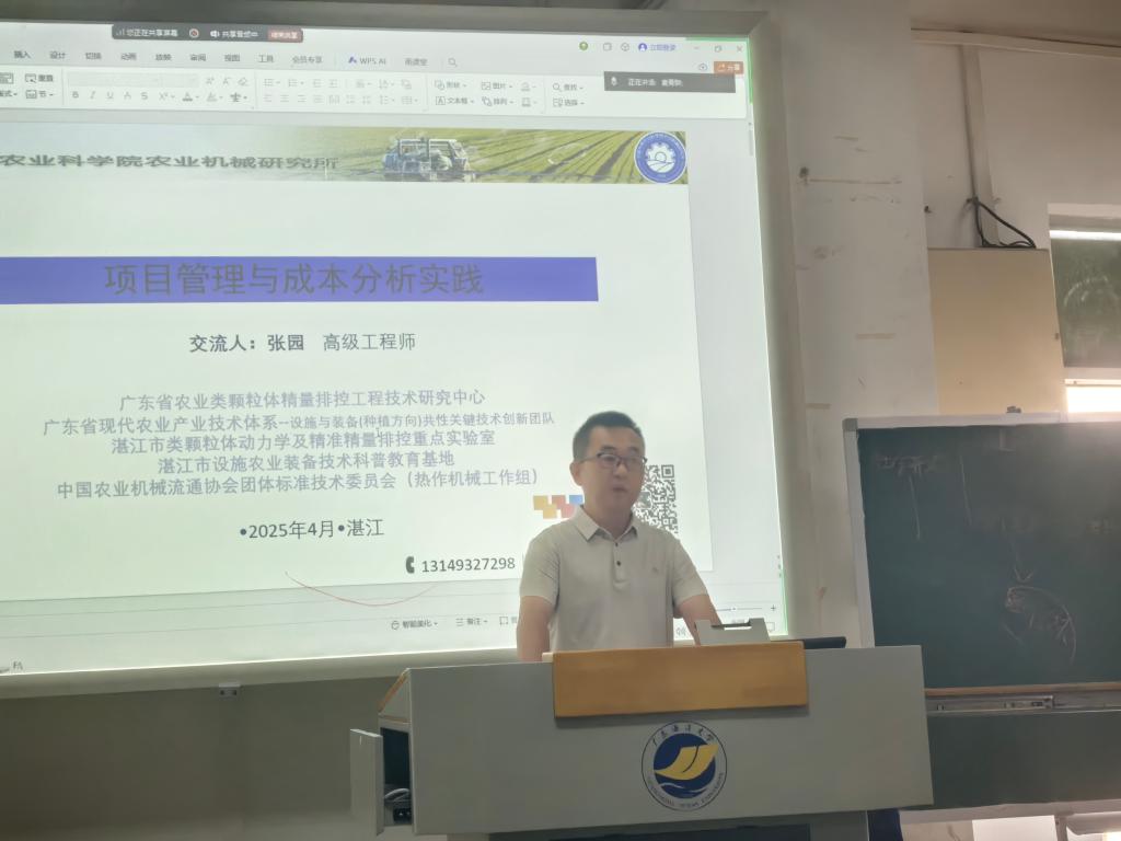 讲座伊始,张园高级工程师介绍了项目管理和成本分析的主要内容,以项目负责人的角度介绍了农业装备研发的全流程重点内容、工作、管理等,主要包括项目的选题与立项、项目实施过程的管理、评价与成本效益分析、验收与成果固化。凭借其丰富的行业经验和深厚的专业知识,以项目为导向,深入浅出地阐述了项目管理和成本分析基本原则在实践中的运用。