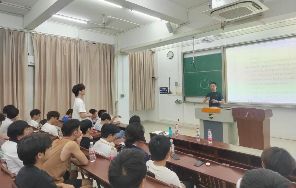 活动的另一高潮是优秀员工分享环节。公司杰出员工、现任广东百源实业有限公司首席增长官(CGO)何高放先生受邀担任分享嘉宾。他以学长身份深情回顾了在校期间参与科创竞赛对其职业发展的深远影响,结合自身从校园到职场的成长轨迹,分享了职业规划、能力培养与职场心态的独到见解。幽默风趣的表达与“干货满满”的内容引发同学们强烈共鸣,互动环节中大家争相提问,何高放先生一一耐心解答,现场气氛持续升温。