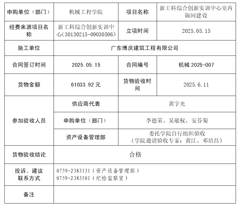 bevictor伟德国际新工科综合创新实训中心室内隔间建设项目已验收,现将验收结果公示,公示时间:2025年6月12日-6月15日。